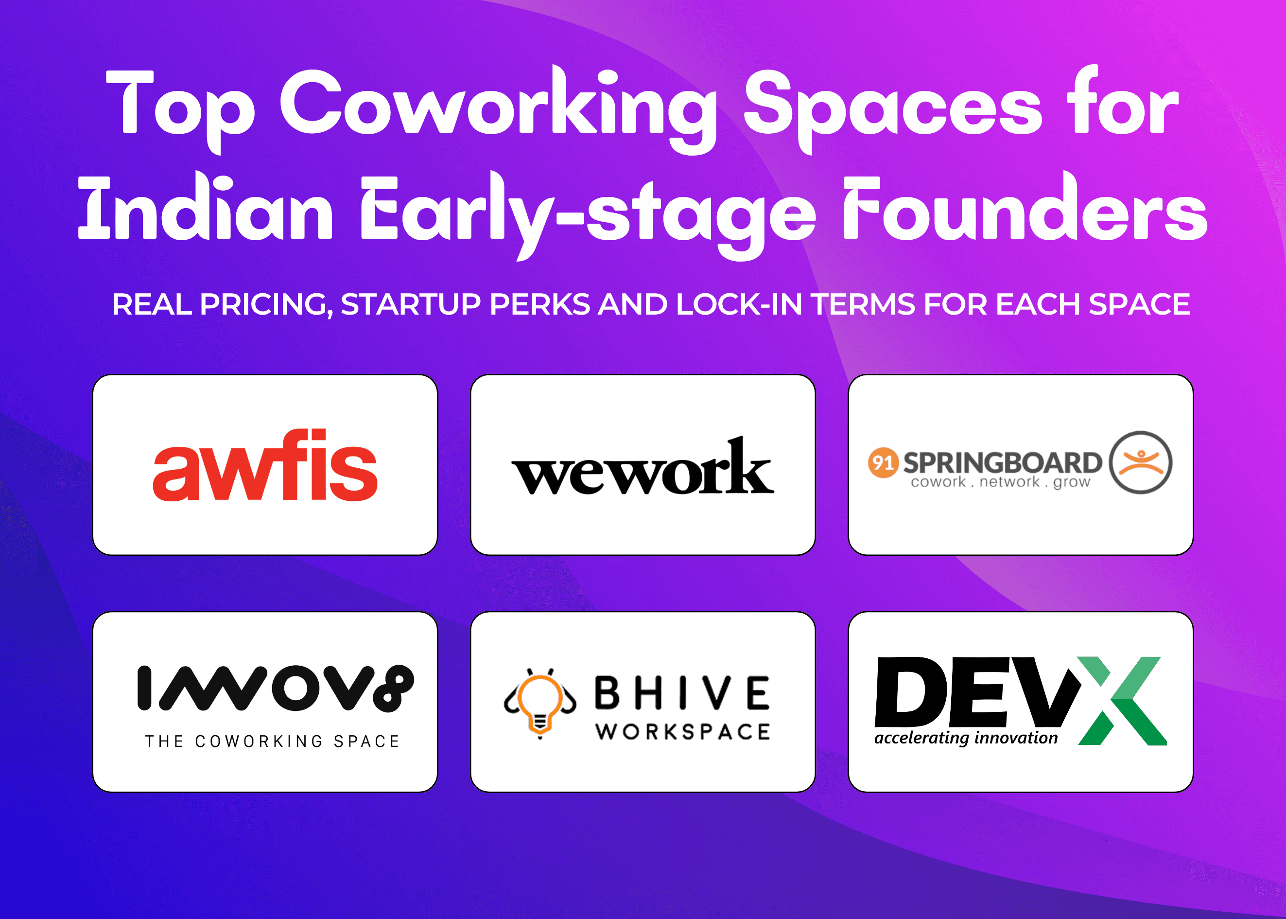 Quick Summary: This guide compares coworking spaces and aggregator platforms for Indian startup founders, updated April 2026. It covers operators including 91springboard, Awfis, WeWork India, BHIVE, DevX, Innov8, Smartworks, IndiQube, AltF, iKeva, GoodWorks, Etherea, Incuspaze, GoHive, The Office Pass and Workafella. It also compares aggregators myHQ, CoFynd, Qdesq, GoFloaters and FlexoSpaces. Pricing ranges from ₹75/day (BHIVE) to ₹55,900/month (WeWork). Includes a stage-wise recommendation table for solo founders through Series A teams.